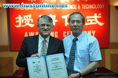 副校长罗俊,国际交流处、国家脉冲强磁场科学中心(筹)相关负责人出席了授聘仪式。国际交流处常务副处长余海林主持仪式,国家“”入选者、脉冲强磁场科学中心叶培德教授介绍了Klaus von Klitzing教授的简历,罗俊向Klaus von Klitzing颁发了聘书并赠送学校礼品,并决定在我校设立以Klaus von Klitzing命名的系列高水平科研讲座。