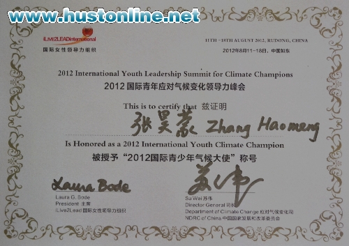 根据2011年联合国应对气候变化哥本哈根峰会的决议,今年由中国承办国际青年绿色领导力培训班。中国国家发展改革委和总部设在华盛顿的国际女性领导力组织,于今年8月中旬在“全国绿色能源示范县”江苏省如东县,共同举办了“2012国际青年应对气候变化领导力峰会”夏令营。张昊蒙接到邀请,与来自美国、英国、加拿大、沙特等国家以及国内京沪宁汉等地71名优秀学生一起参加了为期一周的夏令营。夏令营营员们怀着好奇与探索的心态,聆听了高端讲座,考察了如东港口经济、风力发电、垃圾发电、秸秆发电、非晶硅光伏发电等绿色能源项目及其他碳减排生态项目,共同讨论了发展低碳经济、应对全球气候变化的课题。