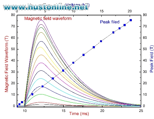 为早日实现目标,中心工作人员加班加点,放弃了节假日的休息,经过几个月的奋战,10月22日,磁体安装到位,电源、控制、测量等系统一切准备就绪,电压从500V逐步上升至5kV、10kV、15kV……10月26日晚,在20 kV充电电压下实现75.5T峰值磁场,此时电流峰值达到35.5kA。